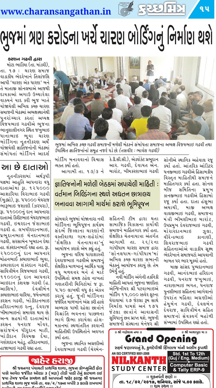भुज कच्छ खाते त्रण करोडना खर्चे चारण बोर्डिंगनुं निर्माण थशे - कच्छमित्रमां करशनभाई गढवीनुं अहेवाल